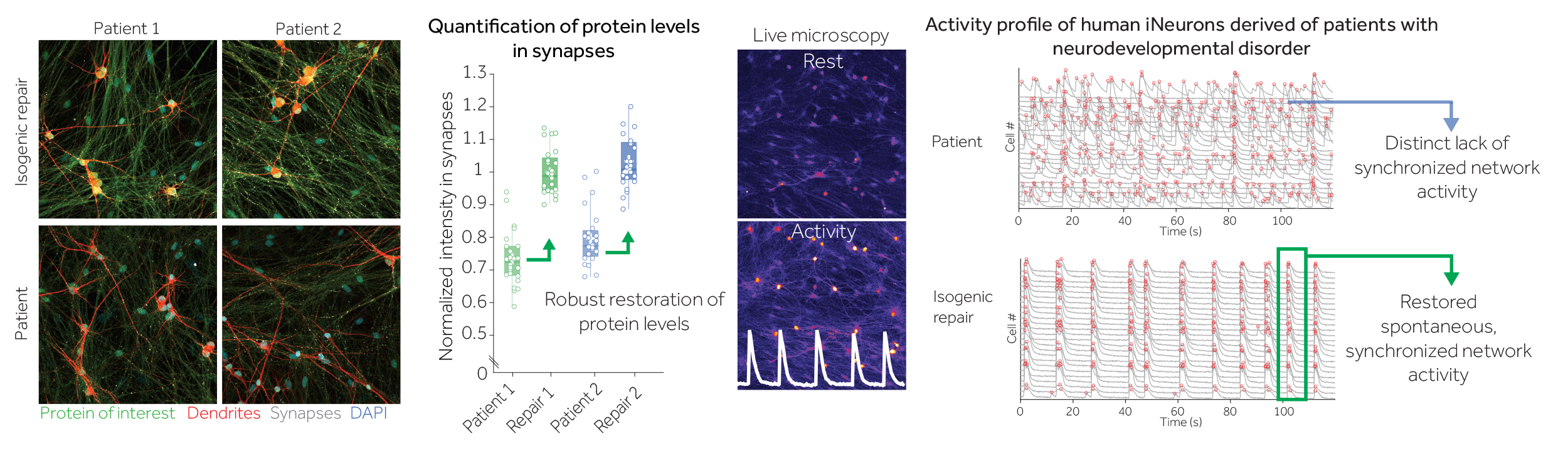 We have fully characterized excitatory and inhibitory iNeurons derived from patient‑specific and isogenic control iPSC lines across multiple neurodevelopmental disorder models. This characterization spans neuronal network dynamics, single‑cell electrophysiology, live microscopy of single synapse function, molecular expression, and detailed morphology, capturing more than 90 quantitative parameters.